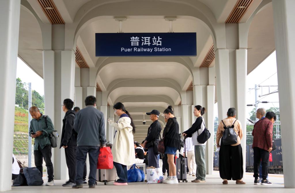 20日、普洱駅で中国ラオス鉄道の列車を待つ人たち。(昆明=新華社記者/邢広利)