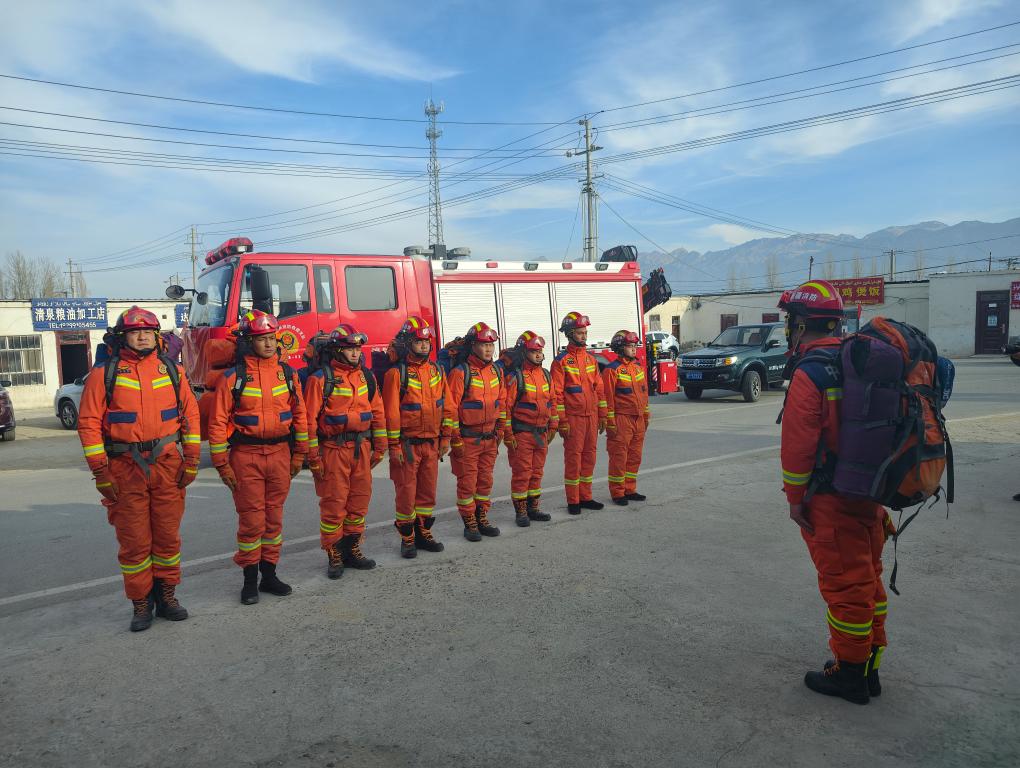 4日、震源地周辺の被災地域に向かう準備をするアクチ県の消防救援隊員。(アクチ=新華社配信)