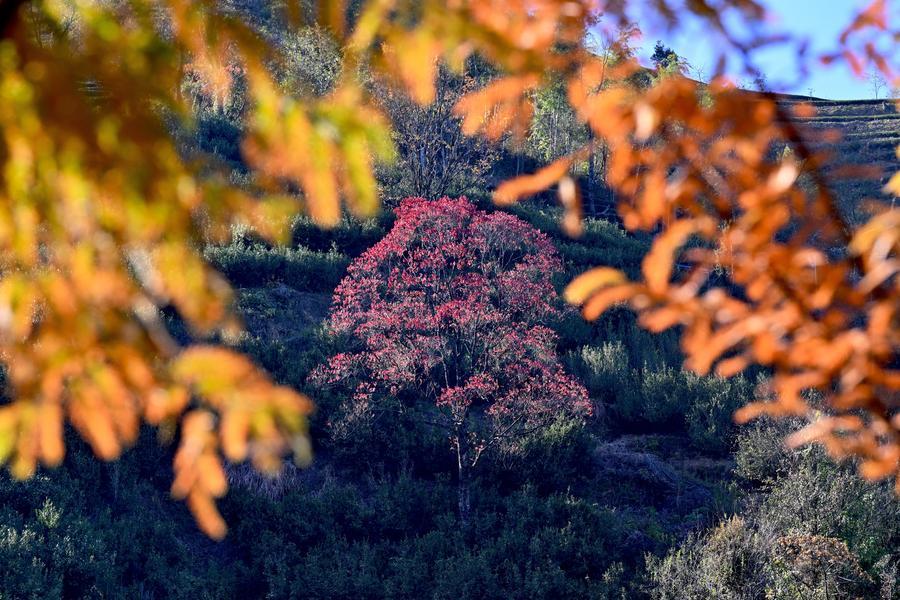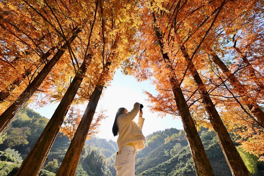 【新華社武夷山12月5日】中国福建省武夷山市でこのほど、カエデやメタセコイアが色づき、見頃を迎えた。山あいに点在する林は青空や水辺の風景と調和し、観光客らの目を楽しませている。
