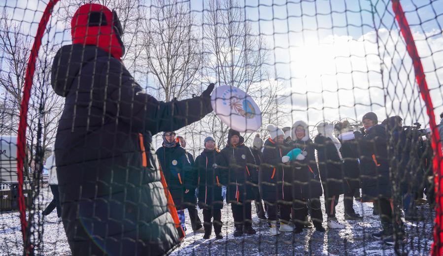 3日、吉林市の納美山谷リゾート区で雪上フリスビーを楽しむ小学生ら。(長春=新華社記者/顔麟蘊)