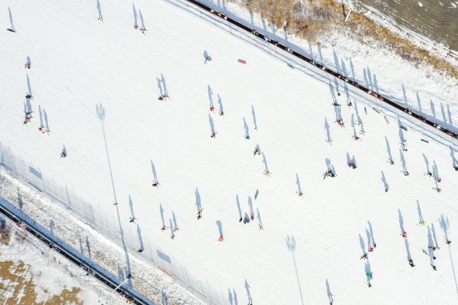 3日、吉林省長春市の天定山スキー場で保護者と共にスキーを楽しむ小中学生ら。(ドローンから、長春=新華社記者/張楠)