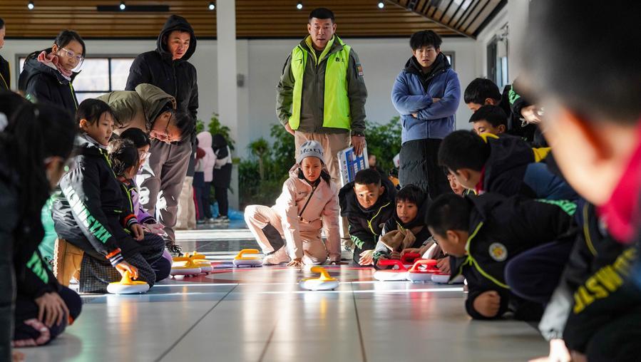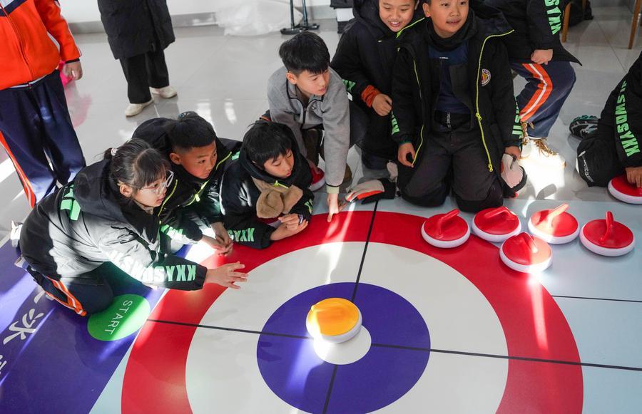 3日、吉林市の納美山谷リゾート区でフロアカーリングを体験する小学生ら。(長春=新華社記者/顔麟蘊)