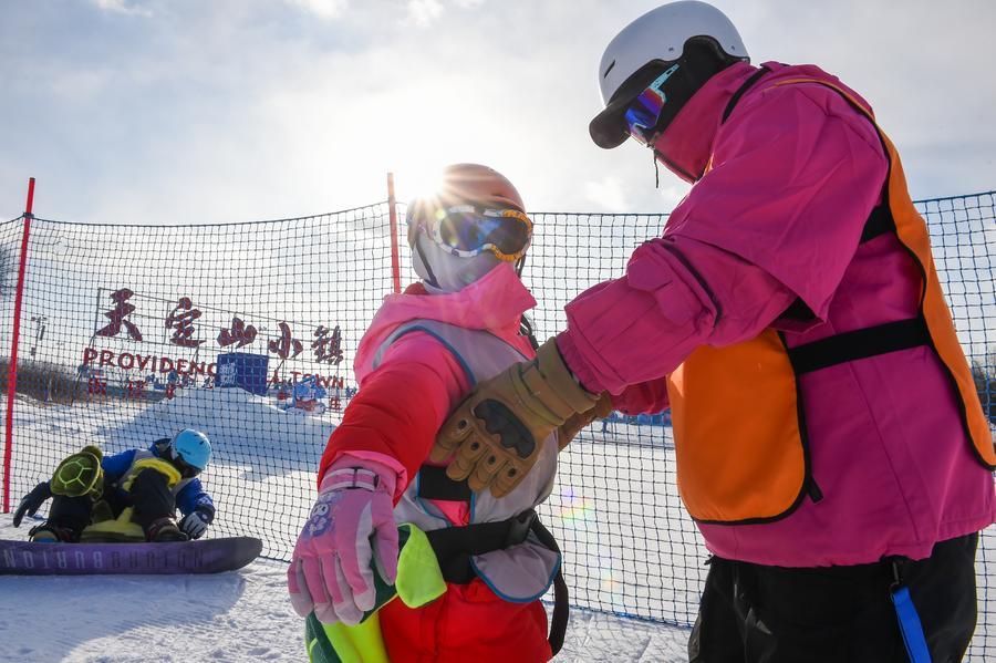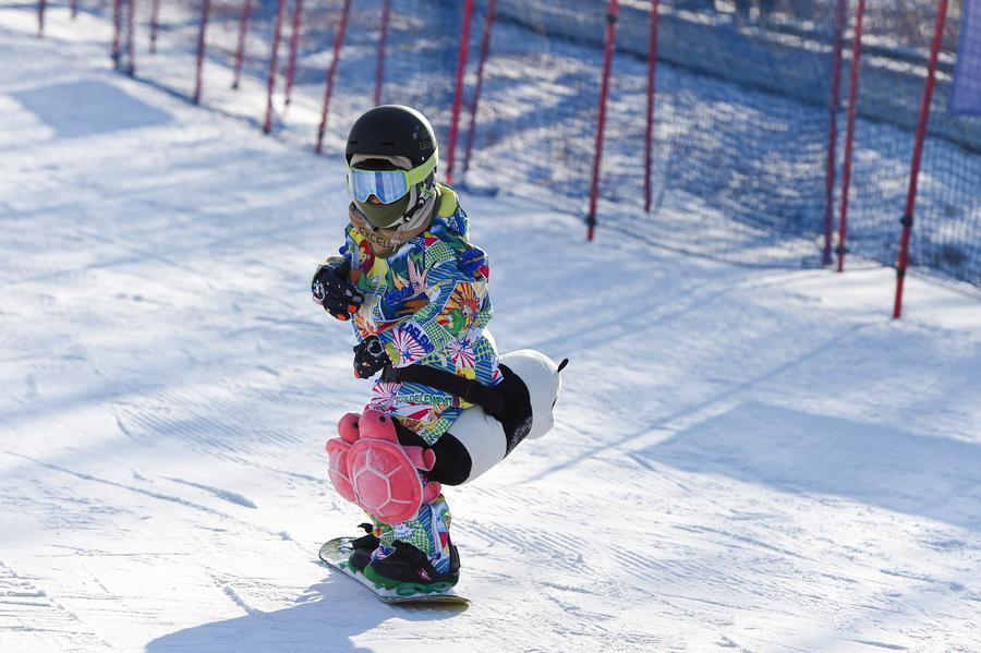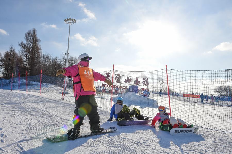3日、吉林省長春市の天定山スキー場でスノーボードを楽しむ小学生。(長春=新華社記者/張楠)