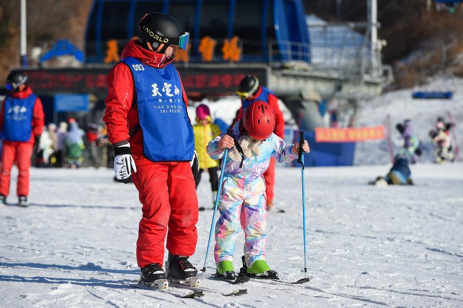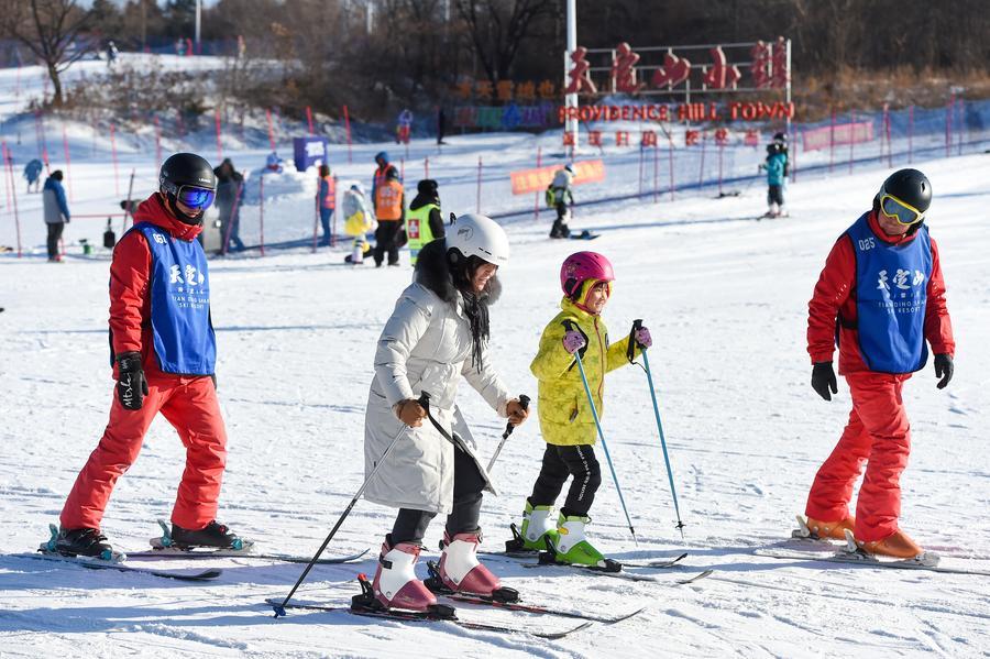 3日、吉林省長春市の天定山スキー場で、保護者と共にスキーの指導を受ける小学生。(長春=新華社記者/張楠)