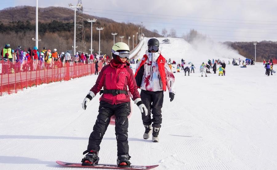 3日、吉林市の納美山谷リゾート区でスキーやスノーボードを楽しむ小中学生。(長春=新華社記者/顔麟蘊)