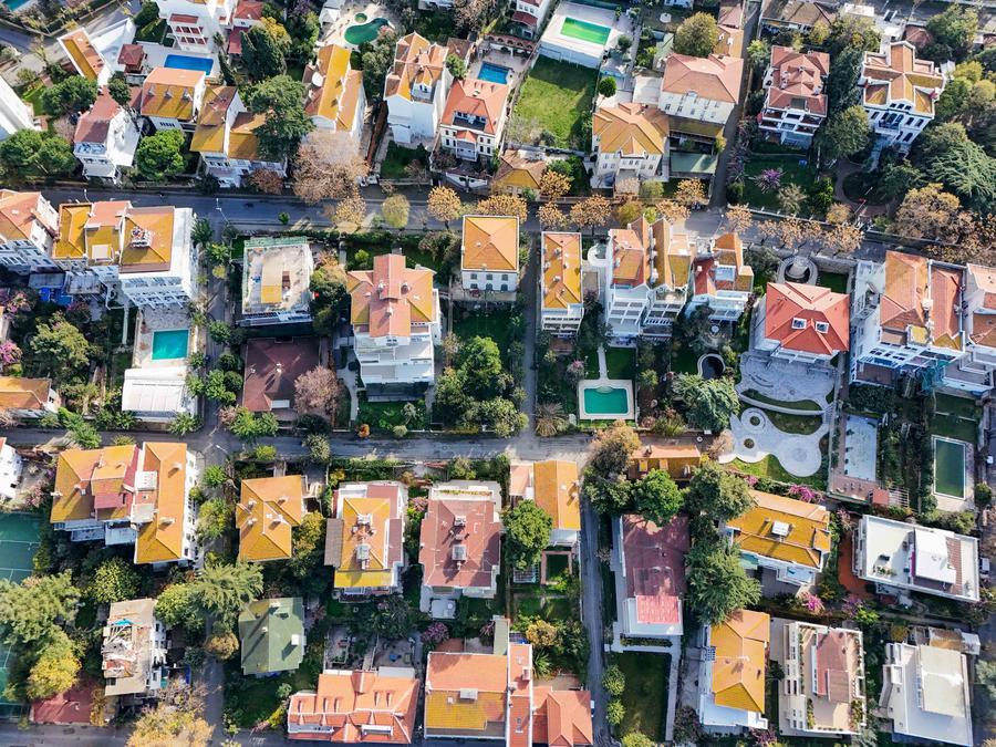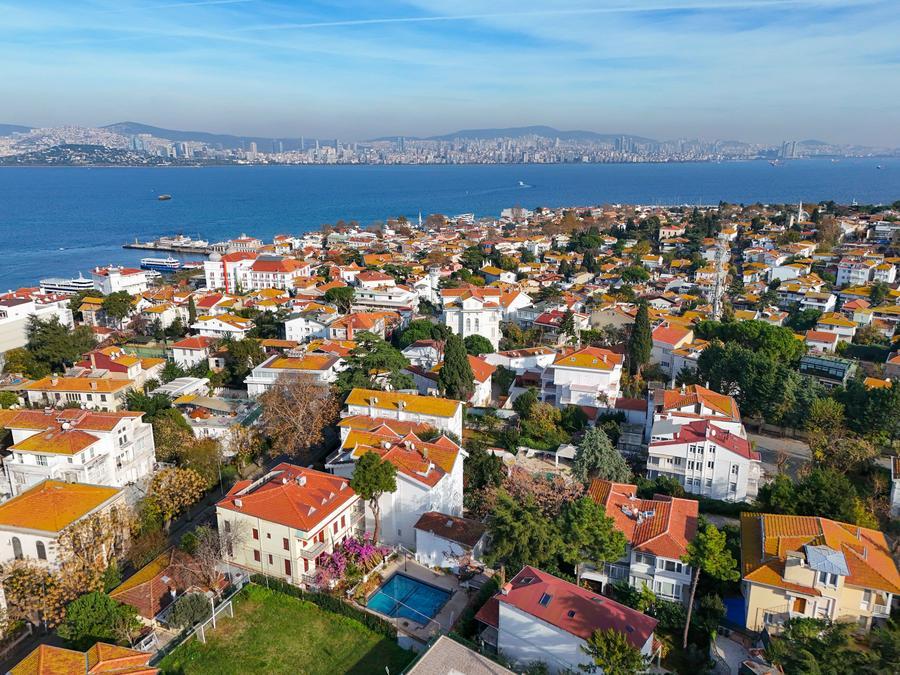 4日、美しい民家の並ぶトルコ・ブユカダ島の景観。(ドローンから、イスタンブール=新華社記者/劉磊)