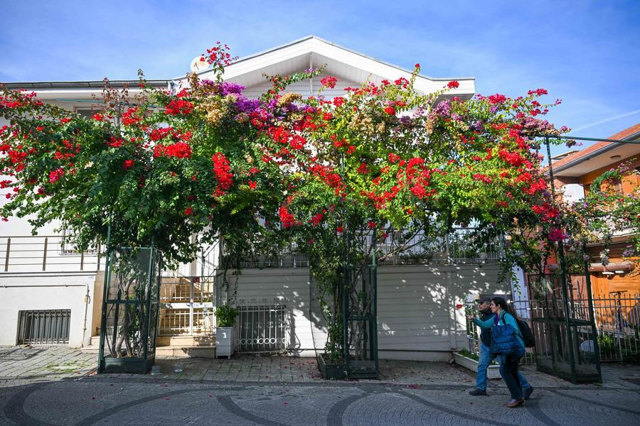 4日、鮮やかな花に彩られたトルコ・ブユカダ島の民家。(イスタンブール=新華社記者/劉磊)
