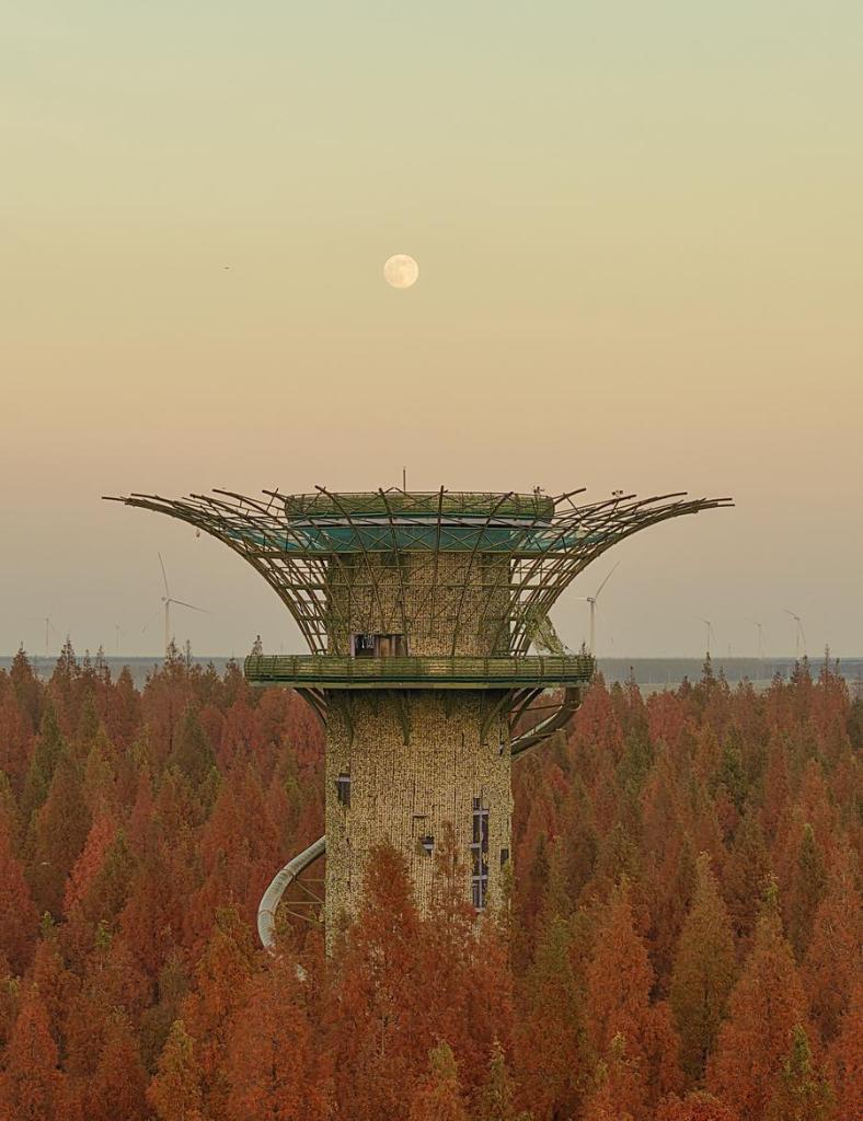 4日夜、江蘇省東台市の黄海国家森林公園の空に浮かぶ満月。(東台=新華社配信/許叢軍)
