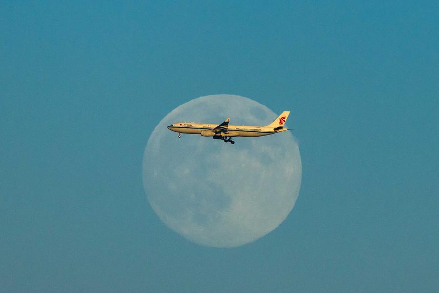 4日夜、北京市の空に浮かぶ満月の前を横切る飛行機。(北京=新華社配信/呉魯萍)