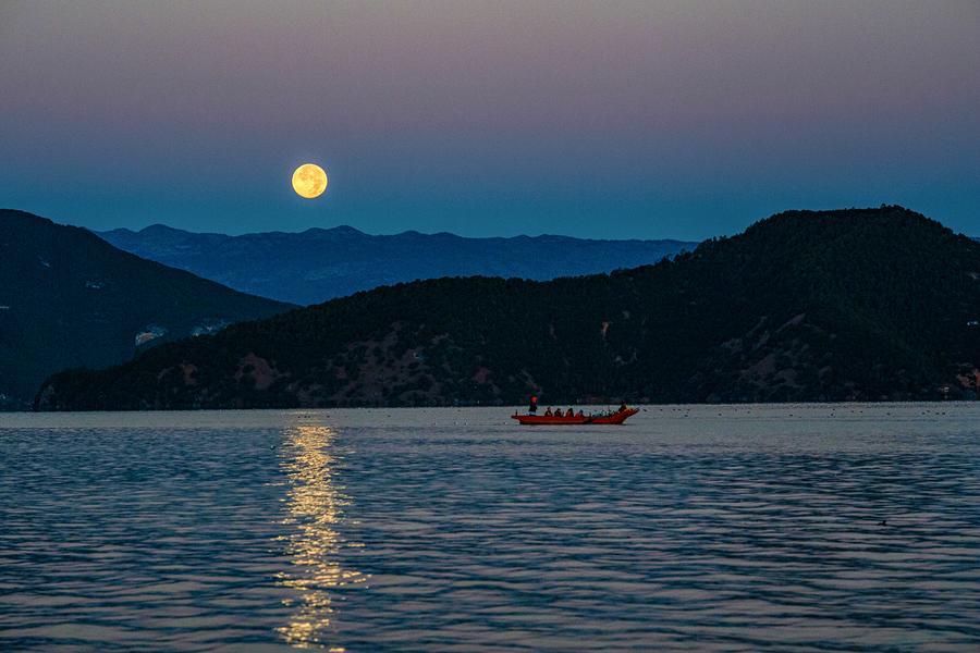 5日朝、雲南省麗江市の瀘沽湖風景区の空に浮かぶ満月。(麗江=新華社配信/任飛翔)