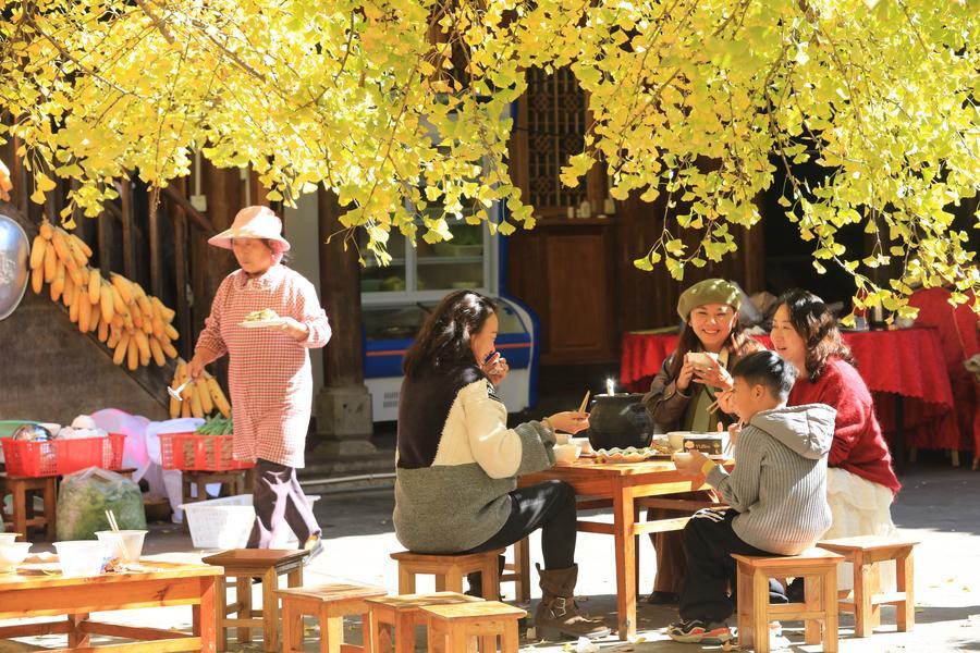 11月27日、江東村の農業体験施設で地元グルメを味わう観光客。(騰衝=新華社配信/龔祖金)