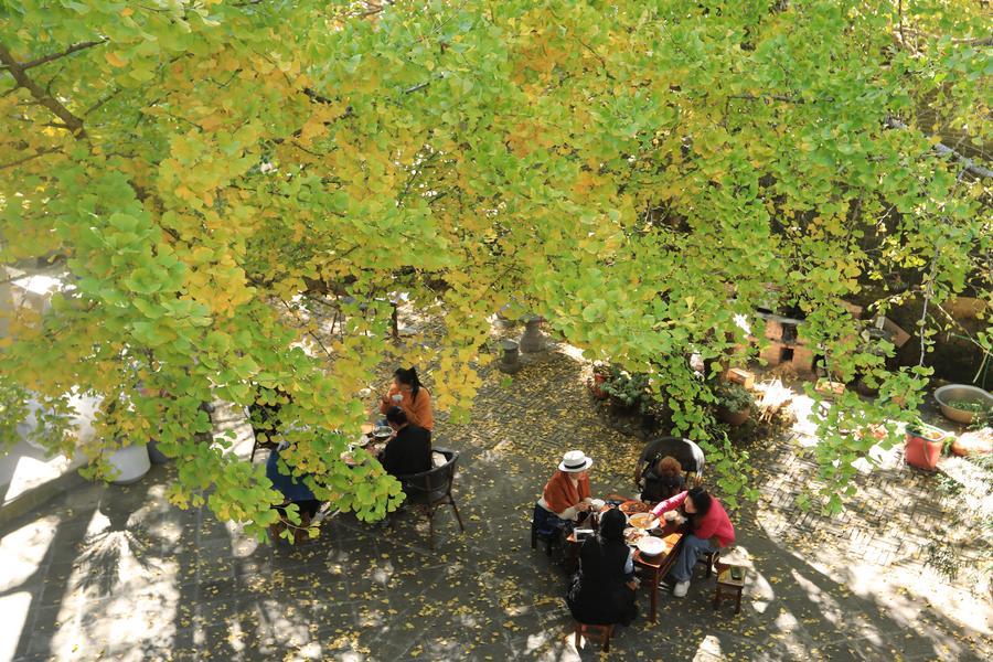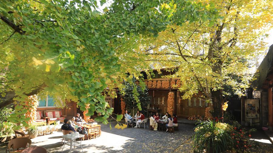 11月27日、江東村でイチョウの黄葉を楽しむ観光客。(騰衝=新華社配信/龔祖金)