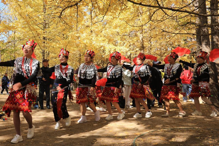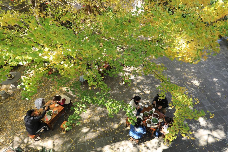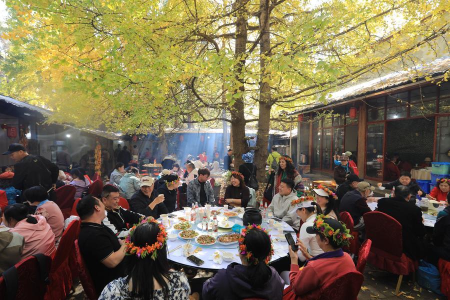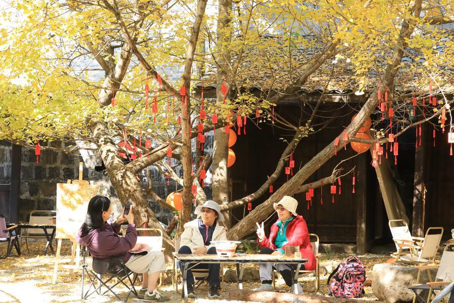 江東村はここ数年、イチョウを軸に経済振興を進め、特色ある観光事業を展開することで新たな産業を生み出し、住民の収入増につなげている。農業体験ができる施設や民宿は当初の8軒から170軒に増え、多くの村民が観光サービス、記念品開発、健康ケア関連の業務に携わるようになった。統計によると、11月以降に受け入れた観光客は連日1万人余りに上り、黄金色の林が毎年数千万元(1元=約22円)の収益をもたらしている。