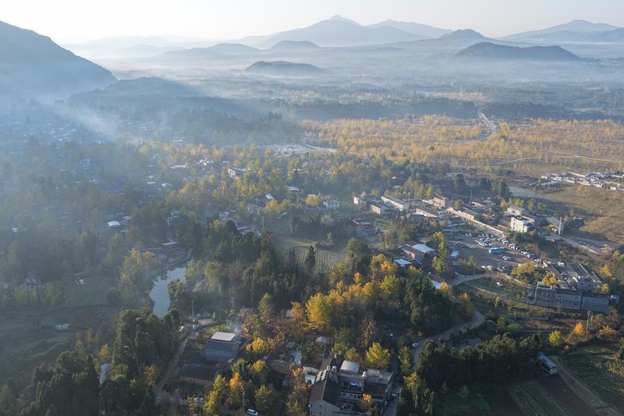 11月27日、「イチョウ村」と呼ばれる江東村の景色。(騰衝=新華社配信/龔祖金)