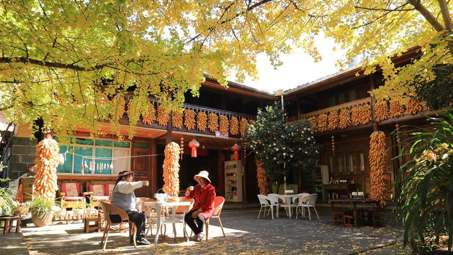 11月27日、江東村の農家の庭でくつろぐ観光客。(騰衝=新華社配信/龔祖金)