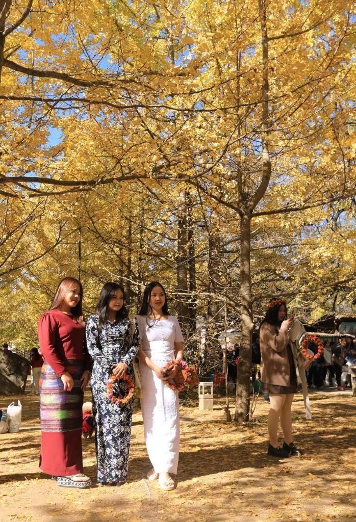 11月29日、江東村のイチョウ林でポーズを取る観光客。(騰衝=新華社配信/龔祖金)