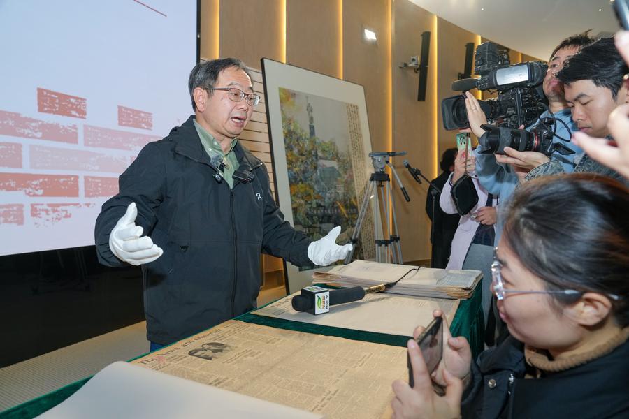5日、新規収集文物史料の解説をする侵華日軍南京大屠殺遇難同胞紀念館の職員。(南京=新華社記者/李博)