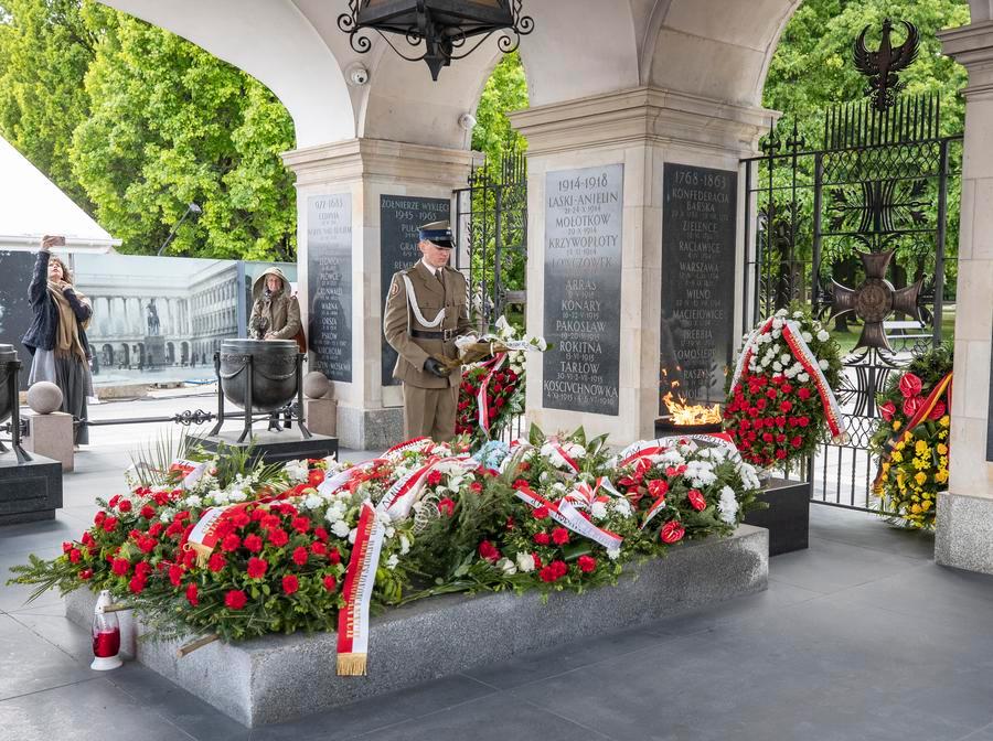 ポーランドの首都ワルシャワにある無名戦士の墓で行われた記念行事。(5月8日撮影、ワルシャワ=新華社記者/張帆)