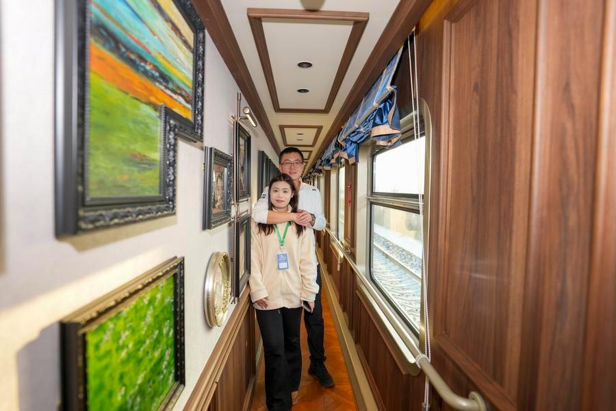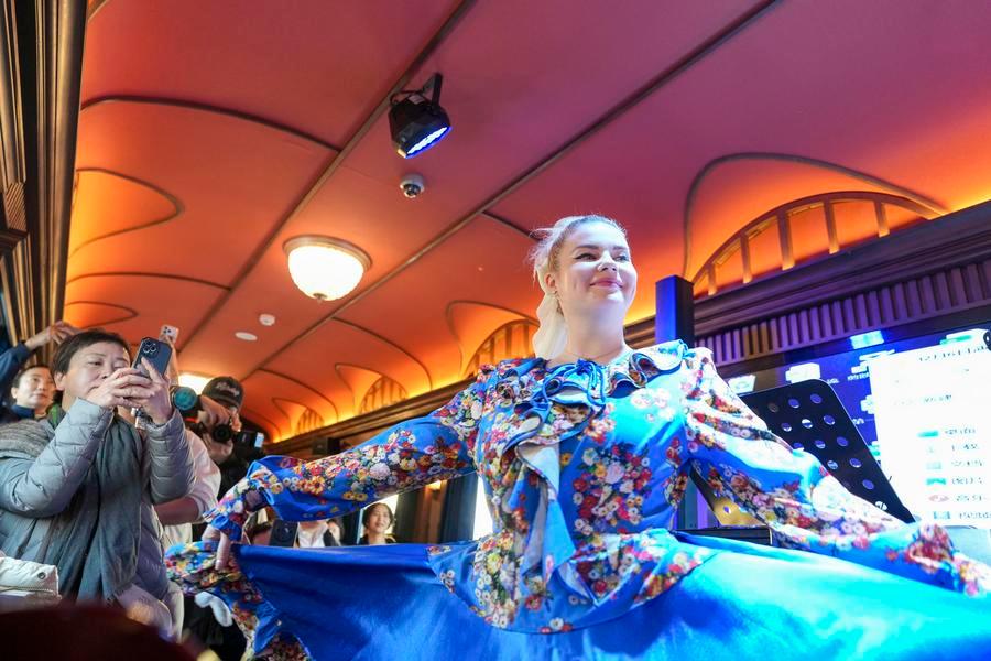 6日、特別観光列車「伊春号」でパフォーマンスを披露する演者。(ハルビン=新華社記者/王松)