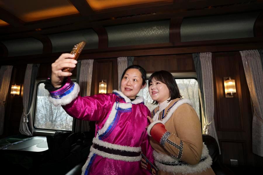 6日、特別観光列車「伊春号」内で写真を撮る乗客。(ハルビン=新華社記者/王松)