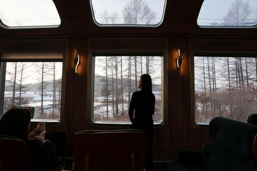 6日、特別観光列車「伊春号」で沿線の風景を眺める乗客。(ハルビン=新華社記者/王松)