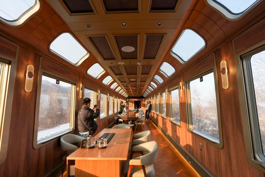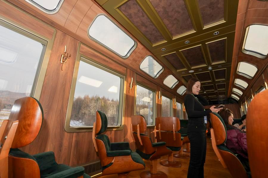 【新華社ハルビン12月7日】中国黒竜江省で6日、特別観光列車「伊春号」が試験運行を行い、招待客約40人を乗せてハルビン駅を出発し、亜布力(ヤブリ)スキー観光リゾートへ向かった。列車は五つのテーマ車両で構成され、楽団の演奏や伝統民族芸能のパフォーマンスなどが行われる。乗客は見て楽しむだけでなく、一部催しには参加もできる。正式運行は28日からを予定している。