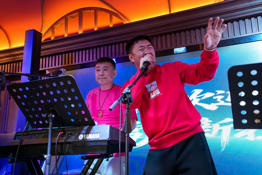 6日、特別観光列車「伊春号」でパフォーマンスする、ハルビン氷雪大世界夢想大舞台の司会者姜可東(きょう・かとう)さん(右)。(ハルビン=新華社記者/王松)