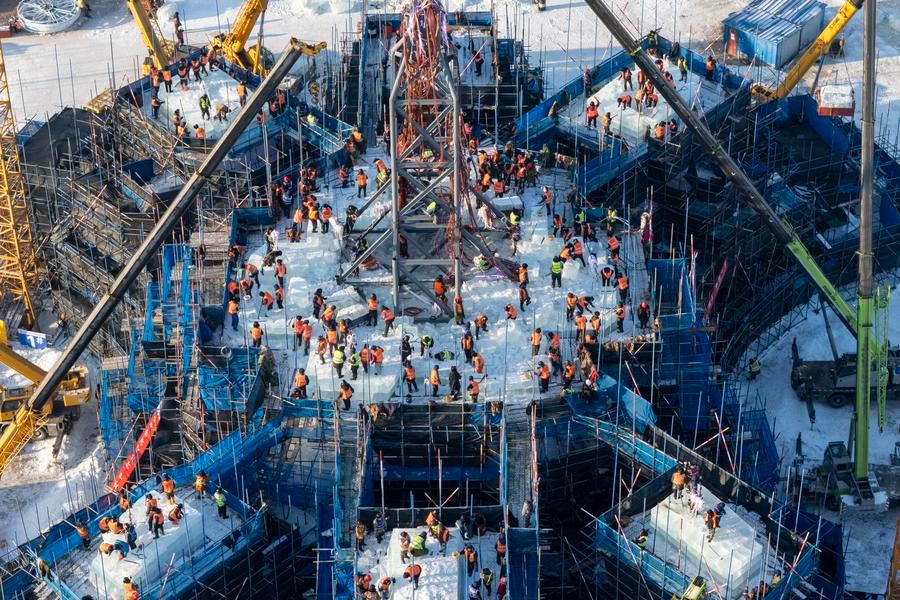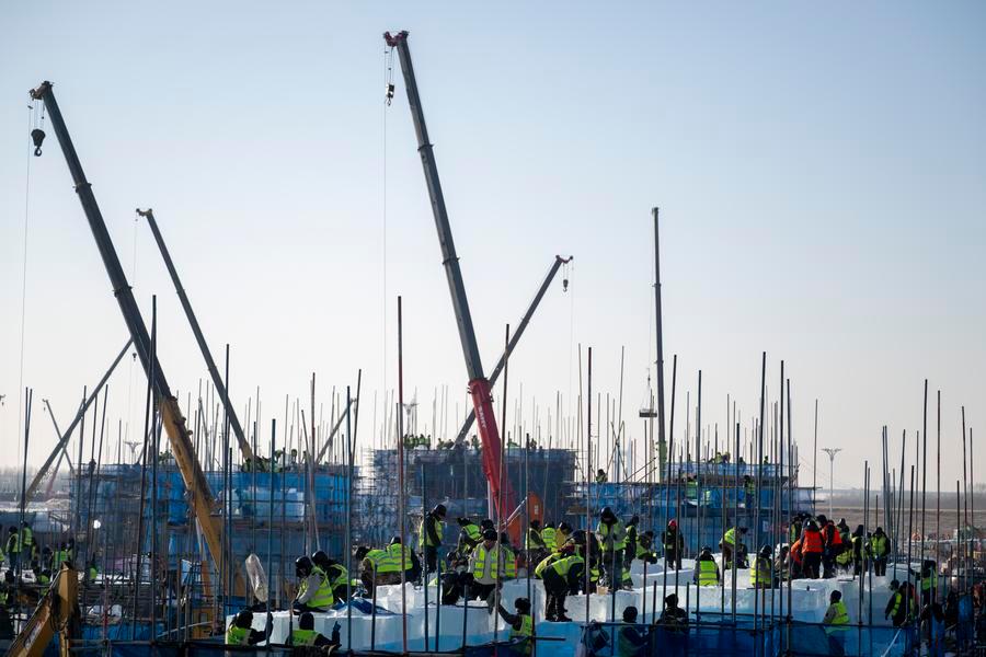5日、氷雪テーマパーク「ハルビン氷雪大世界」の施工現場で氷を設営する作業員。(ドローンから、ハルビン=新華社記者/張濤)