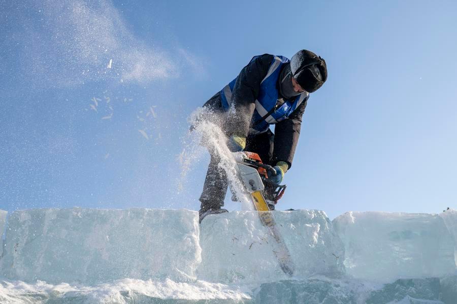 5日、氷雪テーマパーク「ハルビン氷雪大世界」の施工現場で氷を設営する作業員。(ハルビン=新華社記者/張濤)