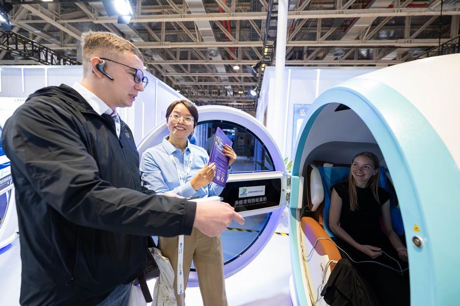 4日、博覧会会場で展示品を見学、体験する参加者。(マカオ=新華社配信)