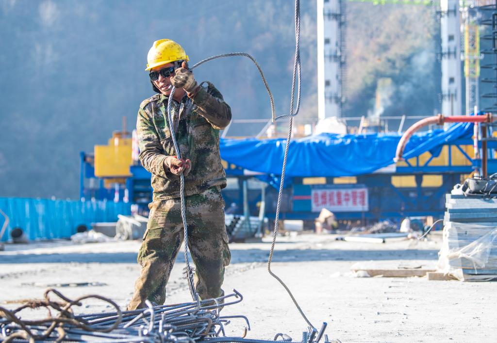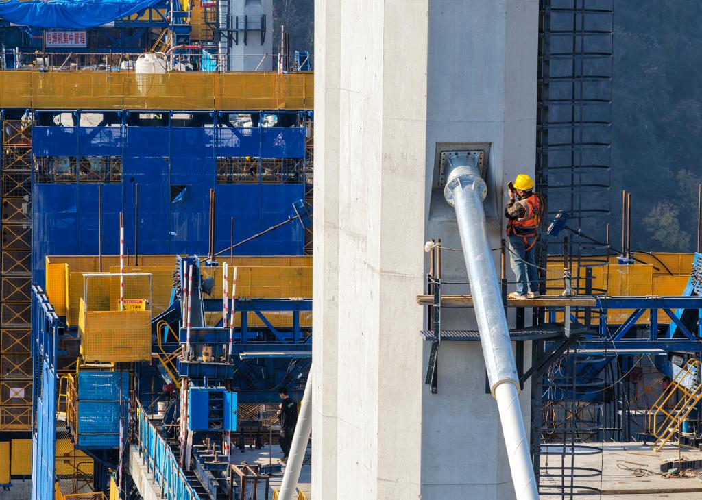 7日、城口任河特大橋の建設現場で働く作業員。(重慶=新華社記者/唐奕)