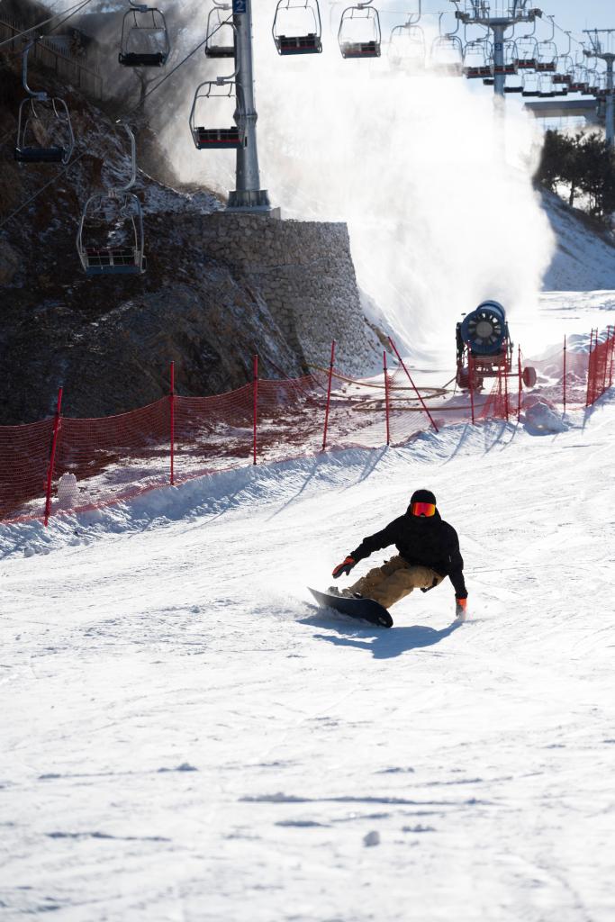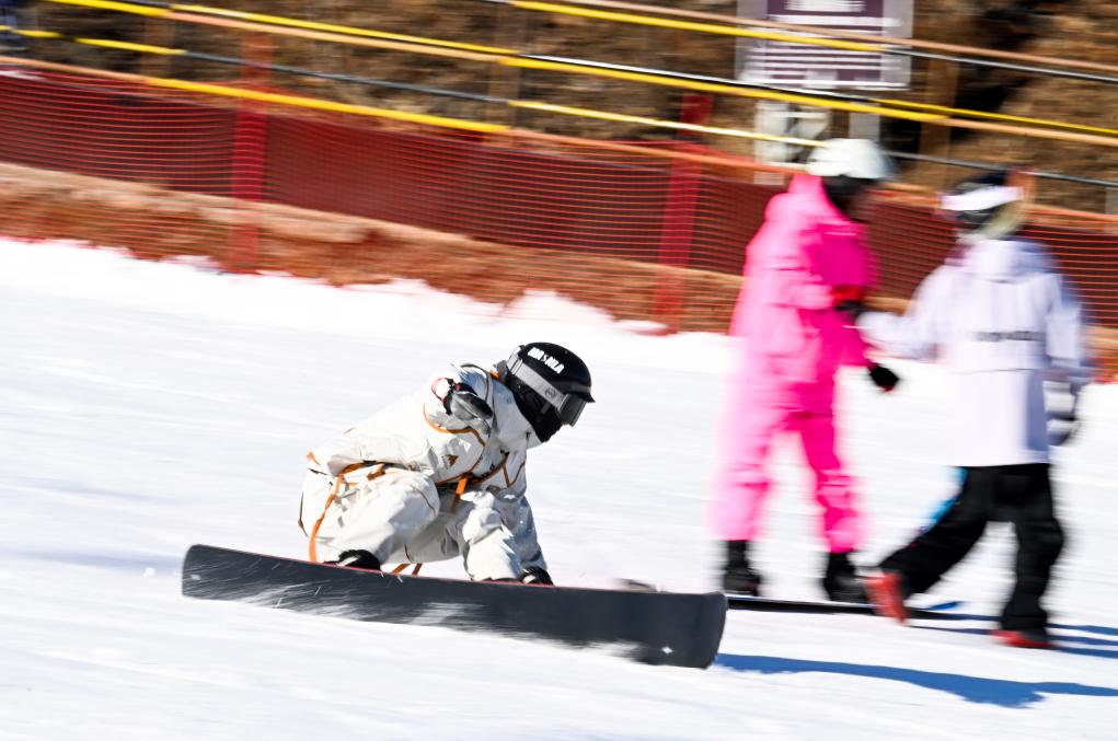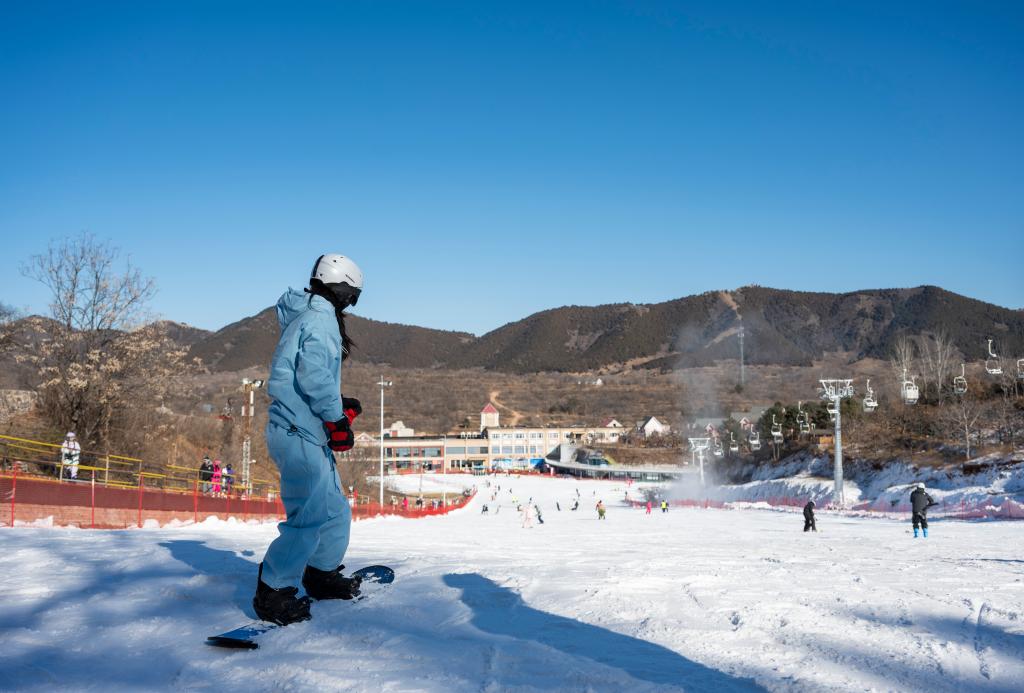 2日、天津市の薊洲国際スキー場でスノーボードを楽しむ観光客。(天津=新華社記者/趙子碩)