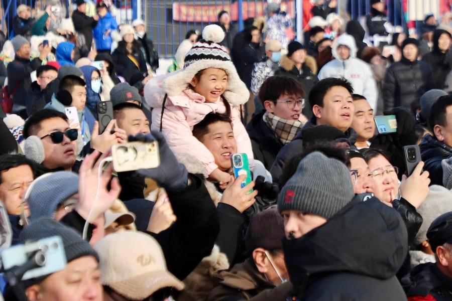 7日、ハルビン採氷祭りでパフォーマンスを見る人々。(ハルビン=新華社記者/孫暁宇)