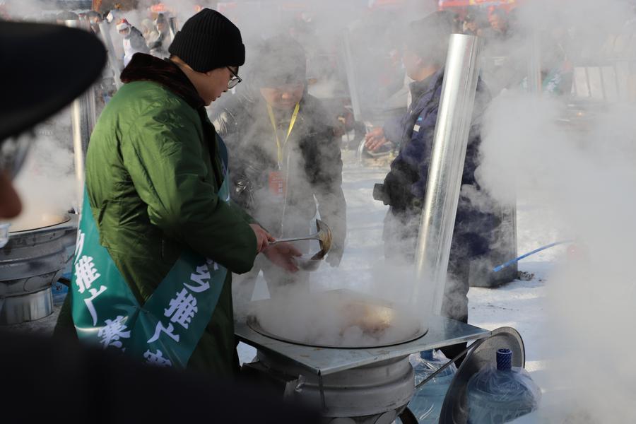 7日、ハルビン採氷祭りで客に魚のスープを配るスタッフ。(ハルビン=新華社記者/孫暁宇)