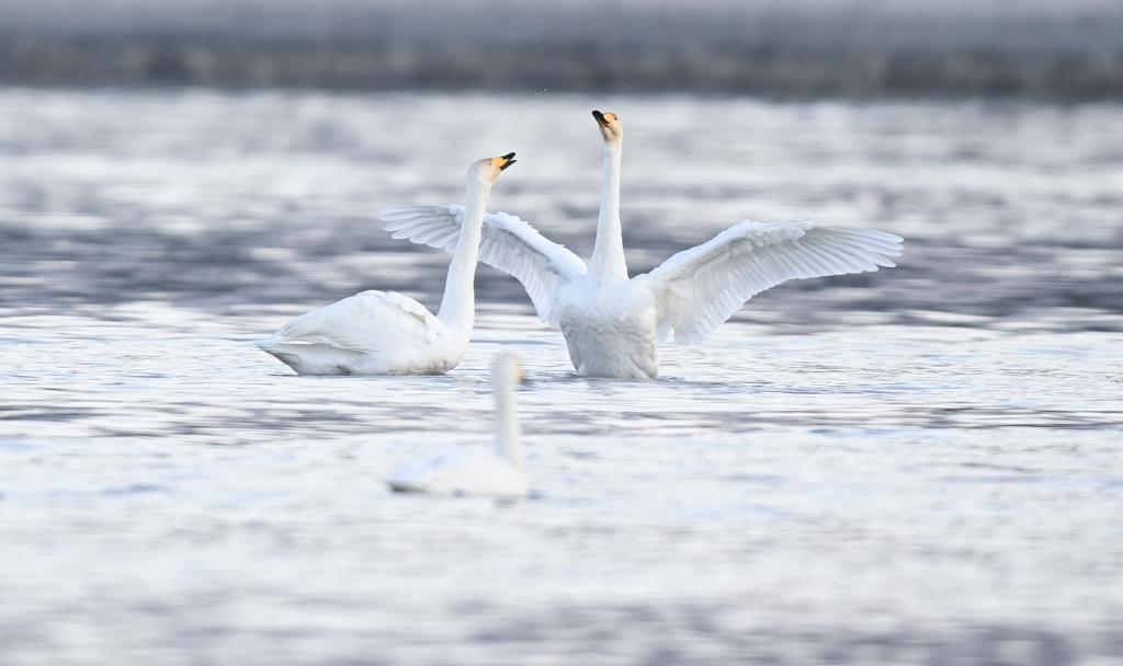 3日、化隆回族自治県を流れる黄河で羽を広げるハクチョウ。(海東=新華社記者/斉芷玥)