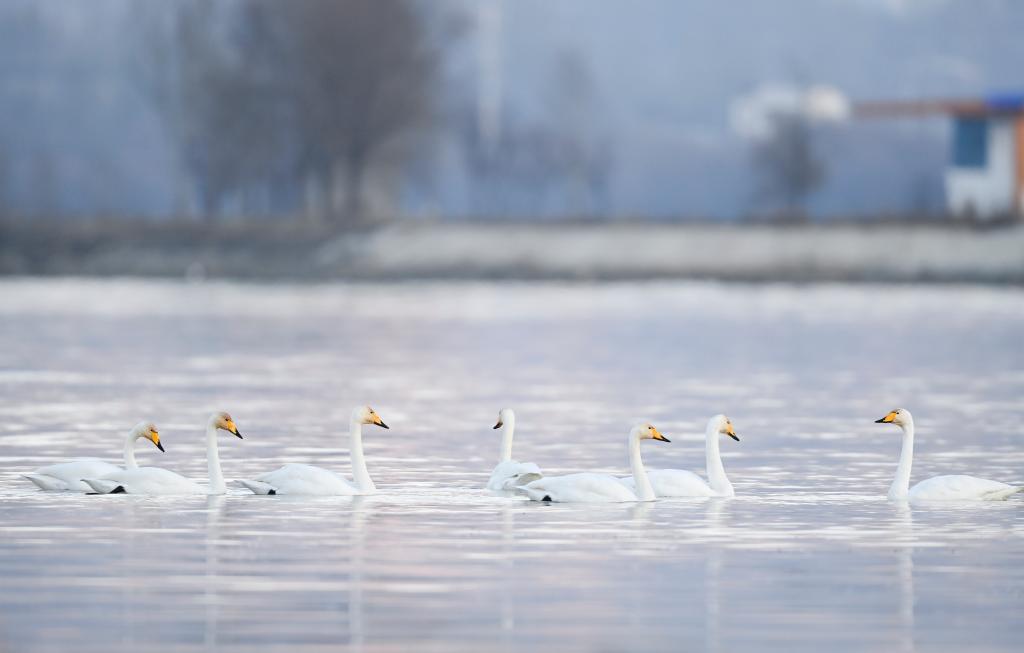 【新華社海東12月9日】中国青海省海東市の化隆回族自治県にある黄河の湿地に、約100羽のハクチョウが越冬のために飛来し、冬景色をいっそう引き立てている。