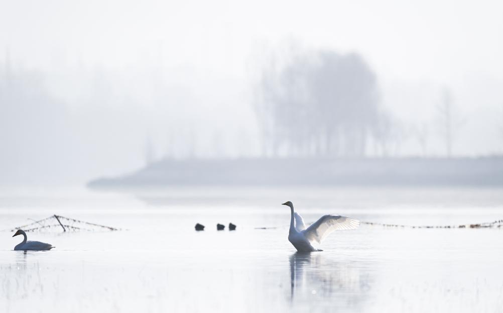 2日、化隆回族自治県を流れる黄河で羽を広げるハクチョウ。(海東=新華社記者/斉芷玥)