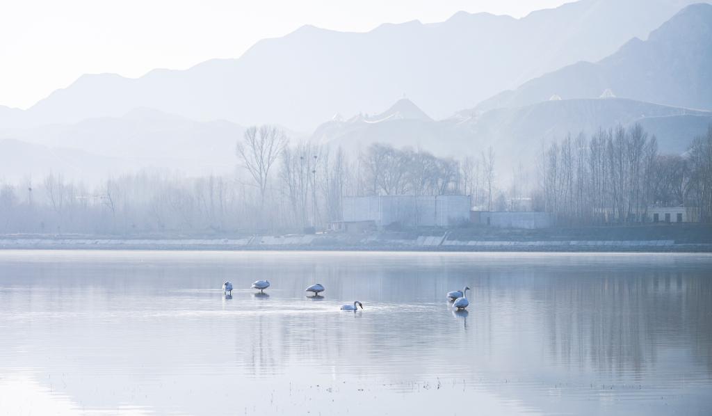 2日、化隆回族自治県を流れる黄河で羽を休めるハクチョウ。(海東=新華社記者/斉芷玥)