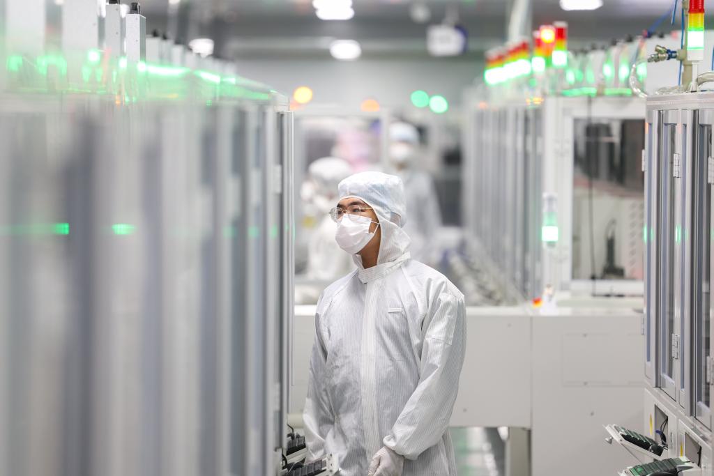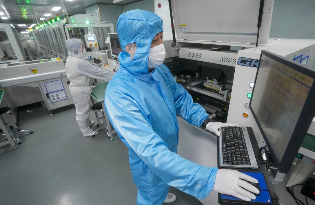 2日、LEDディスプレー製造企業、重慶新視通智能科技のチップを基板に実装するCOBラインで、ダイボンダーの稼働状況を確認する従業員。(重慶=新華社記者/黄偉)
