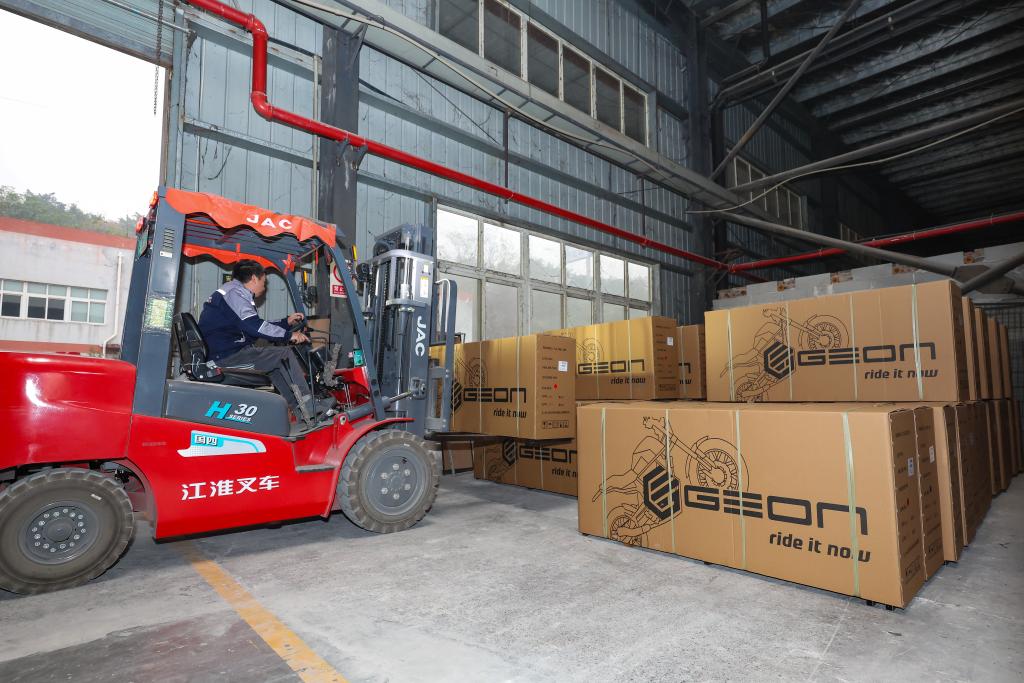 2日、オートバイメーカーの重慶炙焱動力製造で、梱包(こんぽう)を終えたオートバイを運ぶ従業員。(重慶=新華社記者/黄偉)
