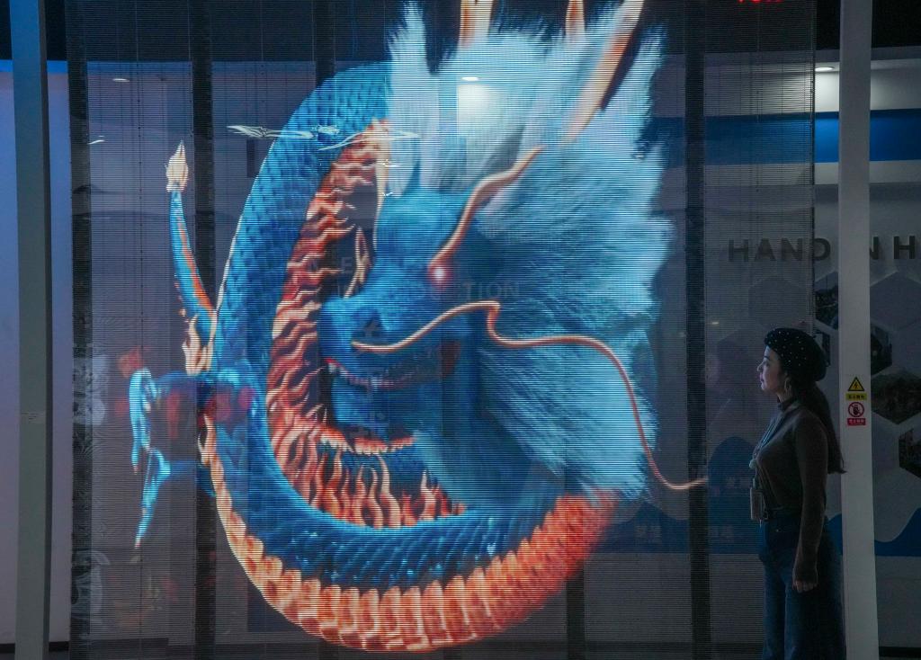 2日、LEDディスプレー製造企業、重慶新視通智能科技の展示ホールで、完成品を紹介する従業員。(重慶=新華社記者/黄偉)