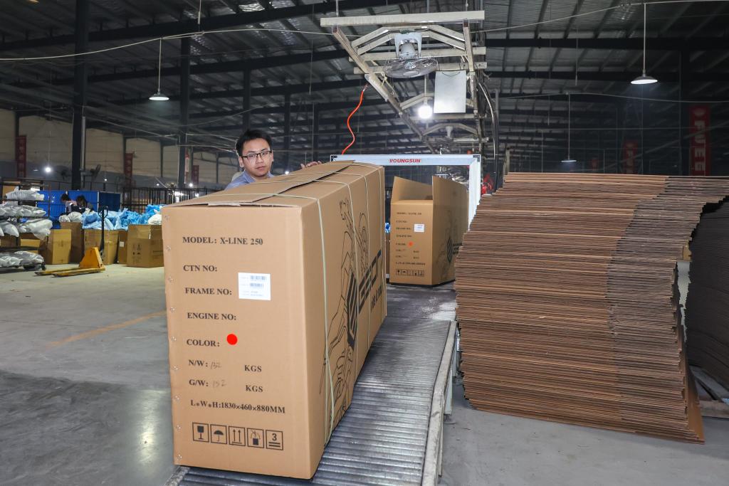 2日、オートバイメーカーの重慶炙焱動力製造で、梱包(こんぽう)を終えた輸出用オートバイを並べる従業員。(重慶=新華社記者/黄偉)