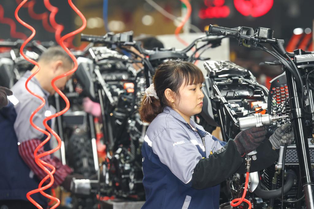 2日、オートバイメーカーの重慶炙焱動力製造の生産ラインで、輸出用オートバイを組み立てる従業員。(重慶=新華社記者/黄偉)