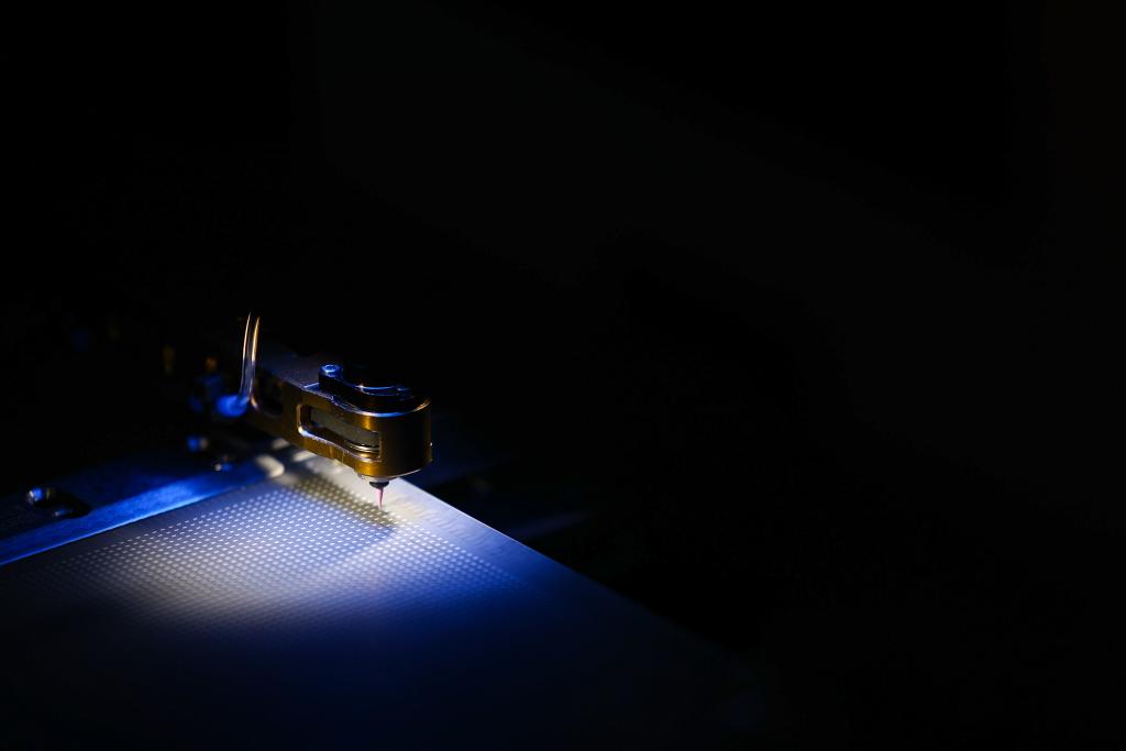 2日、LEDディスプレー製造企業、重慶新視通智能科技のCOBラインで、ダイボンダーがLEDチップを基板に固定している様子。(重慶=新華社記者/黄偉)