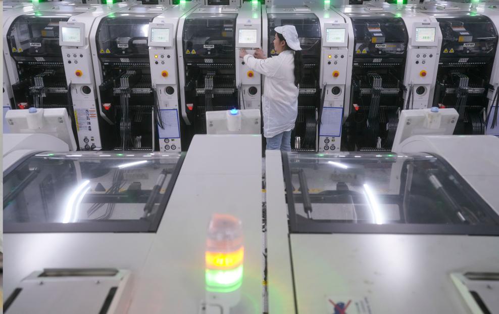 2日、LEDディスプレー製造企業、重慶新視通智能科技の電子部品を基板に実装するSMTラインで、自動実装機を操作する従業員。(重慶=新華社記者/黄偉)