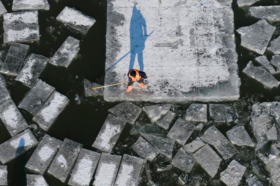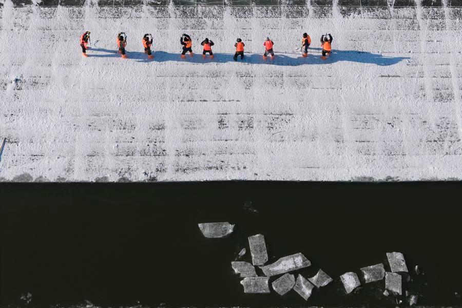 9日、松花江で氷を切り出す人。(ドローンから、ハルビン=新華社記者/張濤)
