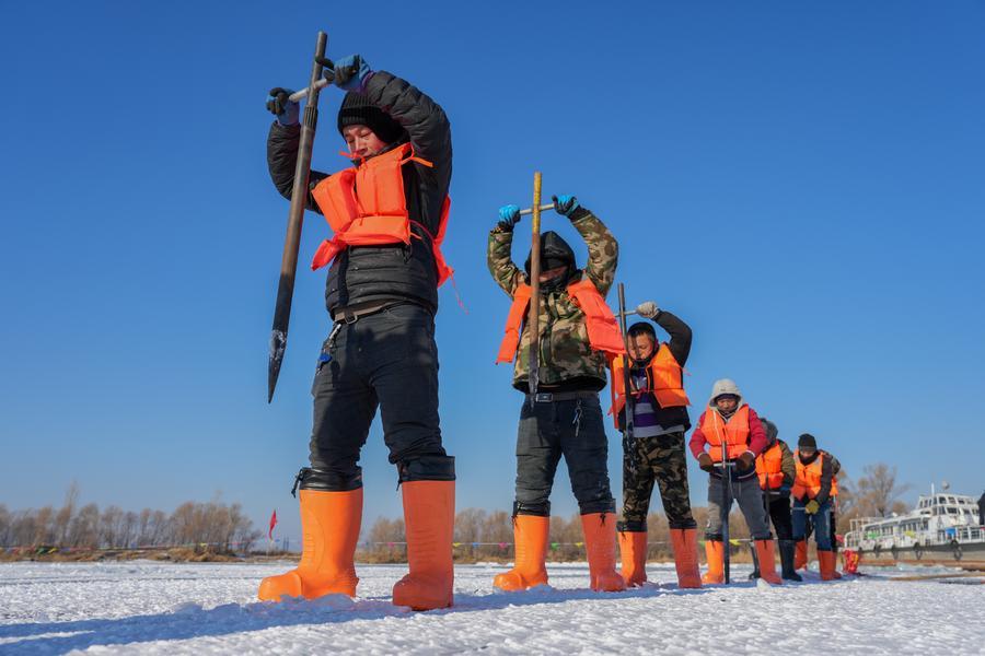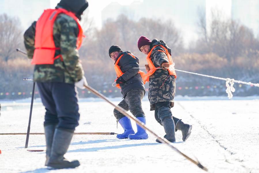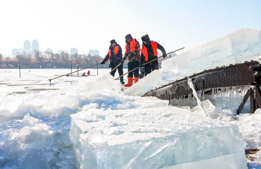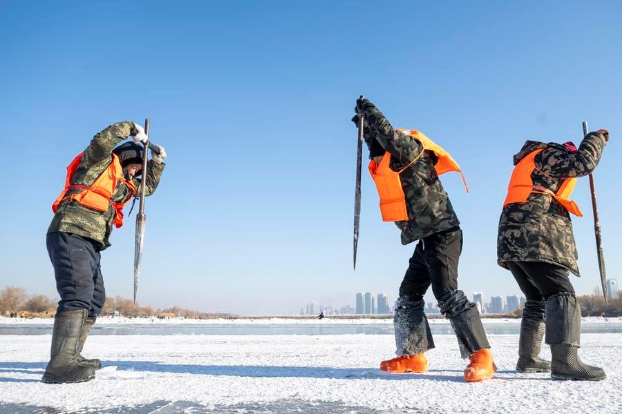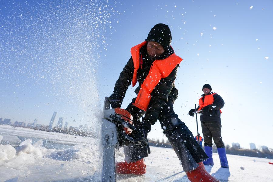 9日、松花江で氷を切り出す人たち。(ハルビン=新華社記者/張濤)