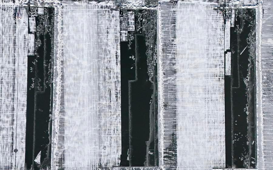 9日、松花江の採氷現場。(ドローンから、ハルビン=新華社記者/王松)
