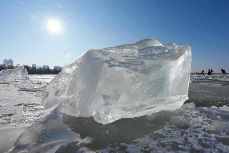 9日、松花江で切り出した氷。(ハルビン=新華社記者/王建威)