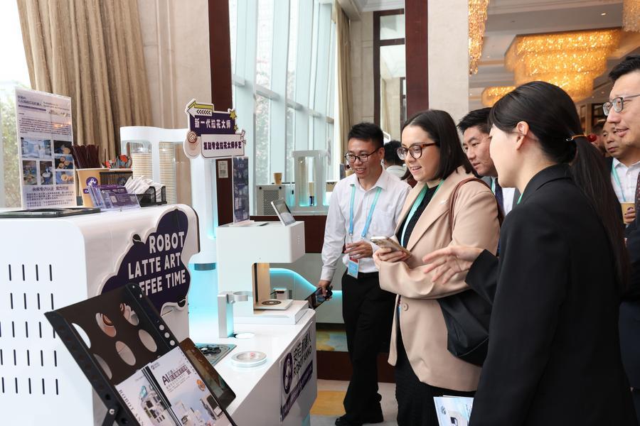 11日、会議の合間にコーヒーロボットを体験する出席者。(深圳=新華社記者/梁旭)